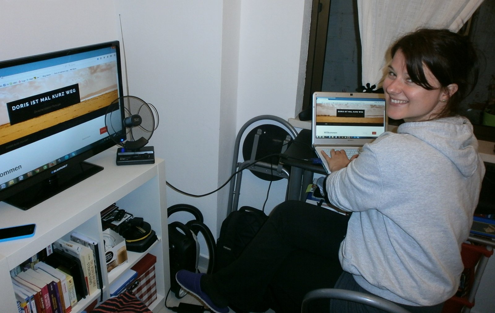 Hier übrigens noch ein Foto von mir beim Bloggen in unserem Wohnzimmer! Voll cool, kann meinen Laptop sogar am Fernseher anschließen und damit sowohl Videos sehen als auch im Großformat meine Posts verfassen! 😉 Ganz liebe Grüße aus Coimbra, ich hoffe es geht euch gut!